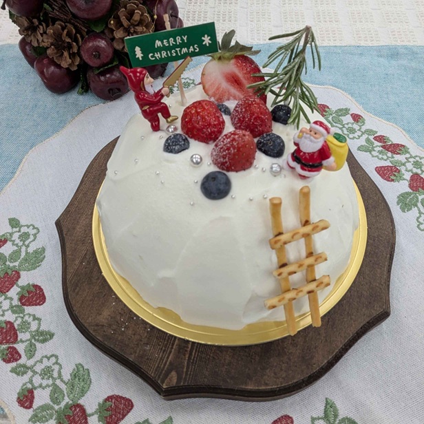 ふわふわのスポンジを焼いて、ドームの形を作ります。中にはたっぷりのクリームとカラフルなフルーツを入れて仕上げます。真っ白なスノードームみたいなケーキにサンタや小人などの飾りを使ってデコレーションしていけば、自分だけのクリスマスケーキの完成です。