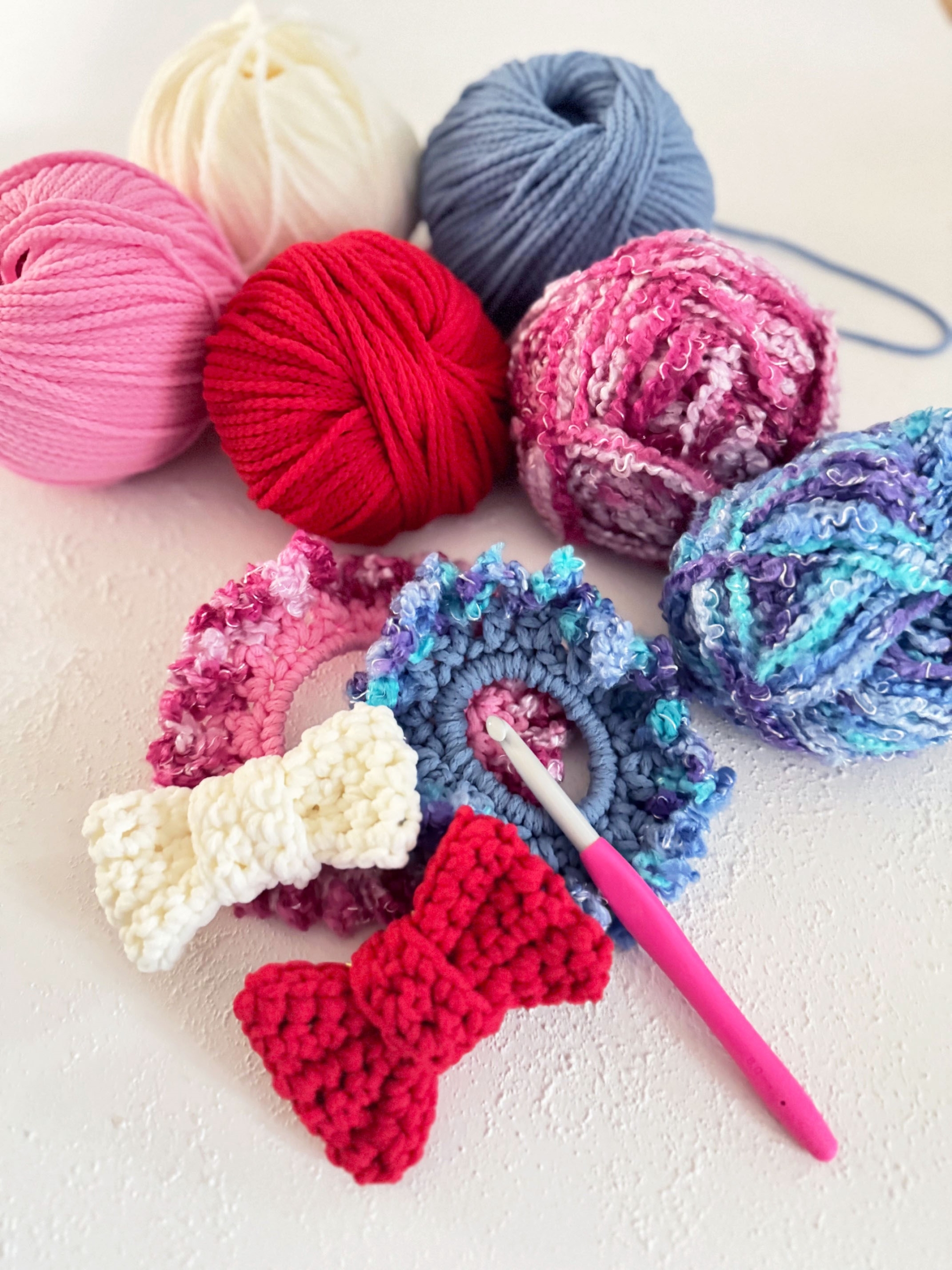 かぎ針編みの基本技法(くさり編み・こま編み・長編み)をはじめに学び、簡単なシュシュ・コースターを好きな色の糸で制作します。